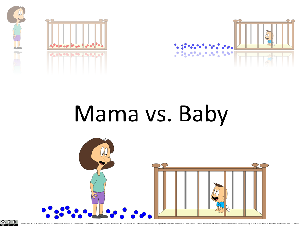 - Die Konzentration c wollen wir in [Bälle/m³] angeben. Wir starten im ersten Szenario mit 24 blauen Bällen auf der Seite der Mutter und nehmen an, dass der Raum ein Kubikmeter groß ist (V = 1 m³).