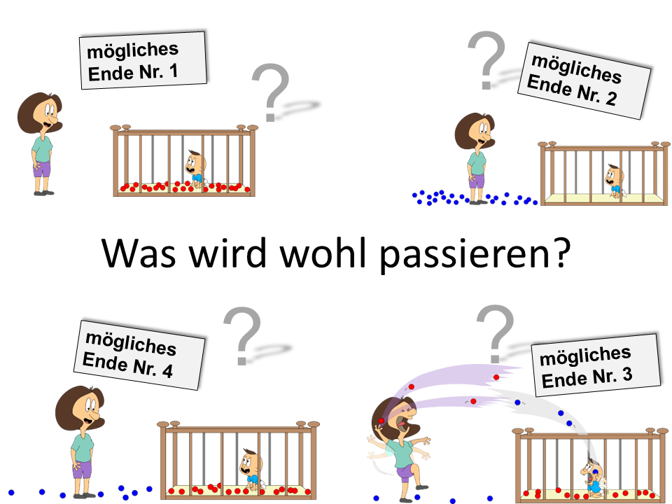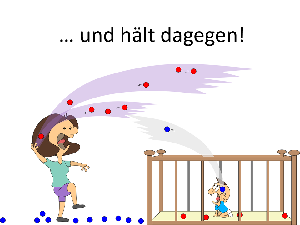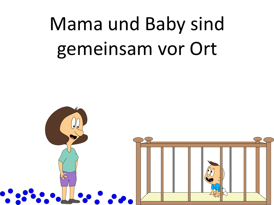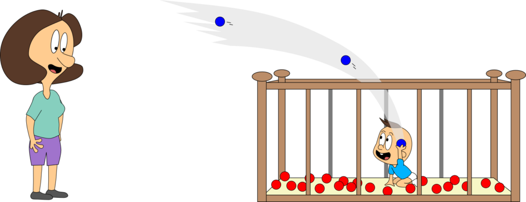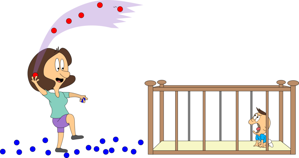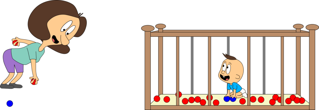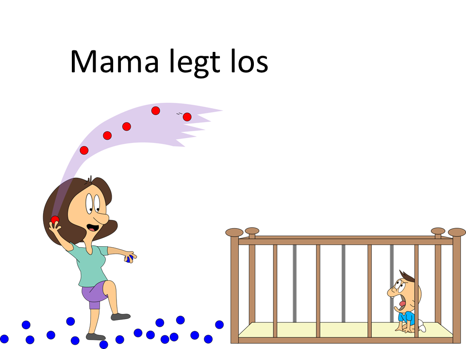 Bei unserem ersten Blick ins Kinderzimmer waren Mama oder Baby stets alleine vor Ort. Stellen wir uns nun vor, sie sind gleichzeitig da. Und stellen wir uns vor, Mama kann die blauen Bälle mit einem Knopfdruck zu roten Bällen machen und Baby kann dies wieder umkehren. Das ist auch für uns ganz praktisch, denn so können wir sie gut unterscheiden.