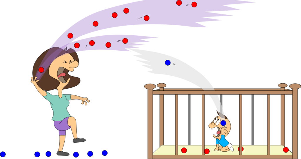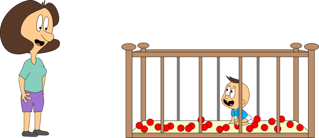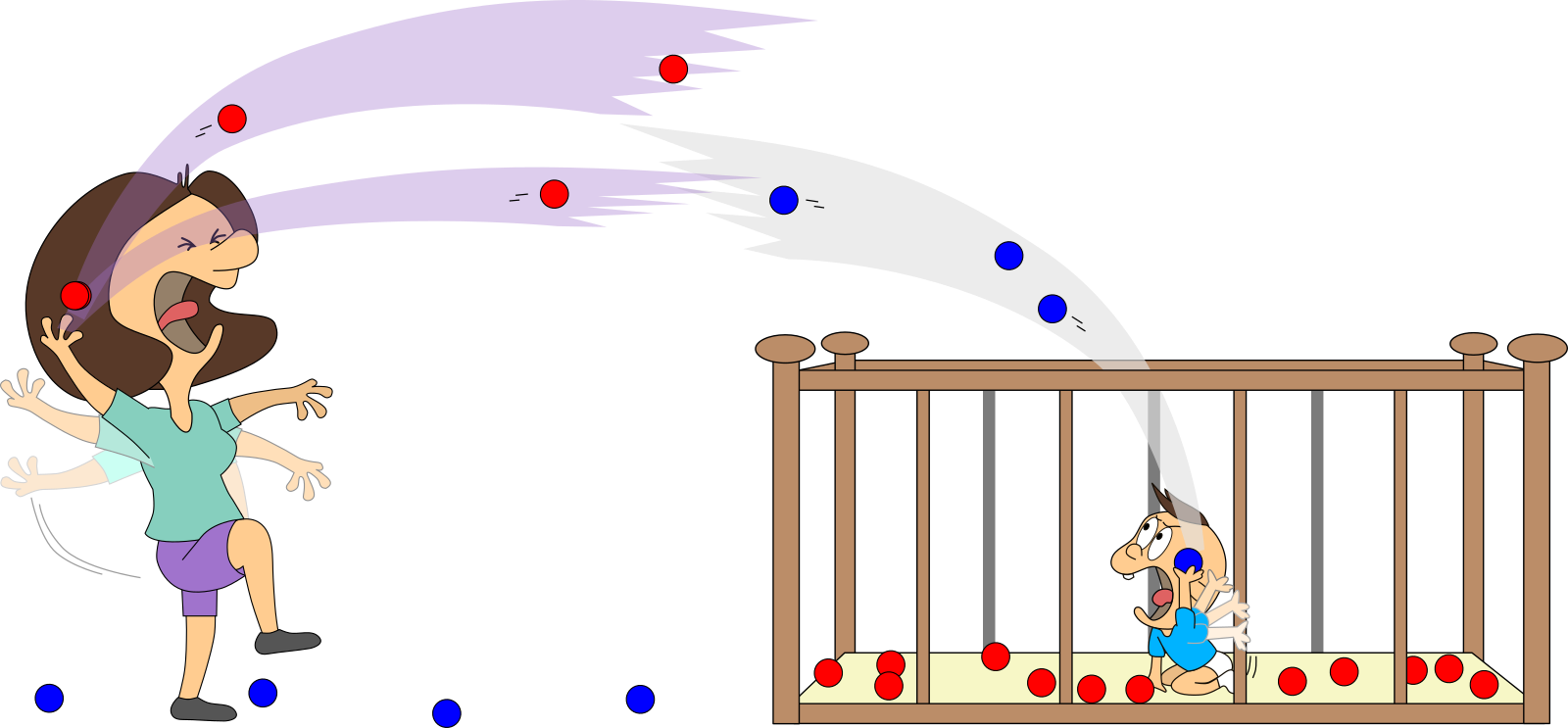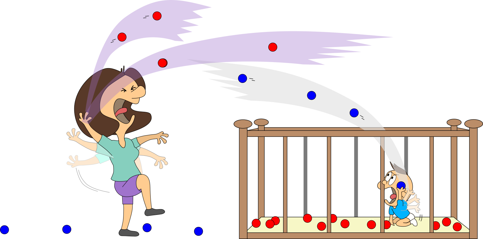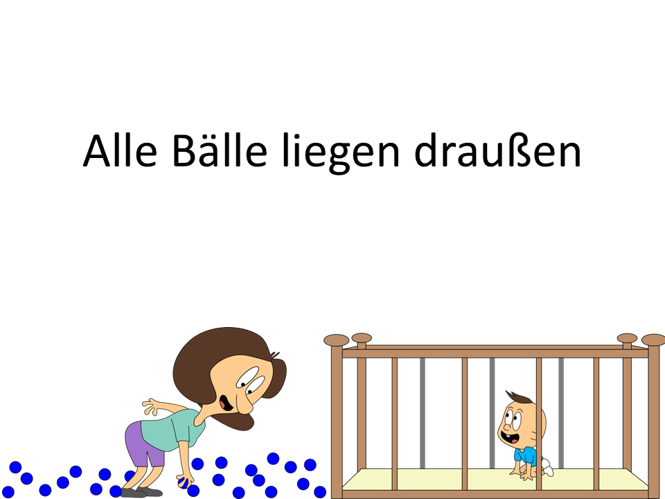Bei unserem ersten Blick ins Kinderzimmer waren Mama oder Baby stets alleine vor Ort. Stellen wir uns nun vor, sie sind gleichzeitig da. Und stellen wir uns vor, Mama kann die blauen Bälle mit einem Knopfdruck zu roten Bällen machen und Baby kann dies wieder umkehren. Das ist auch für uns ganz praktisch, denn so können wir sie gut unterscheiden.