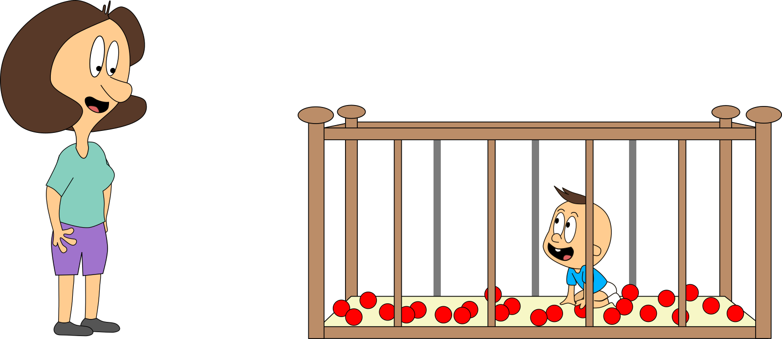 Bei unserem ersten Blick ins Kinderzimmer waren Mama oder Baby stets alleine vor Ort. Stellen wir uns nun vor, sie sind gleichzeitig da. Und stellen wir uns vor, Mama kann die blauen Bälle mit einem Knopfdruck zu roten Bällen machen und Baby kann dies wieder umkehren. Das ist auch für uns ganz praktisch, denn so können wir sie gut unterscheiden.