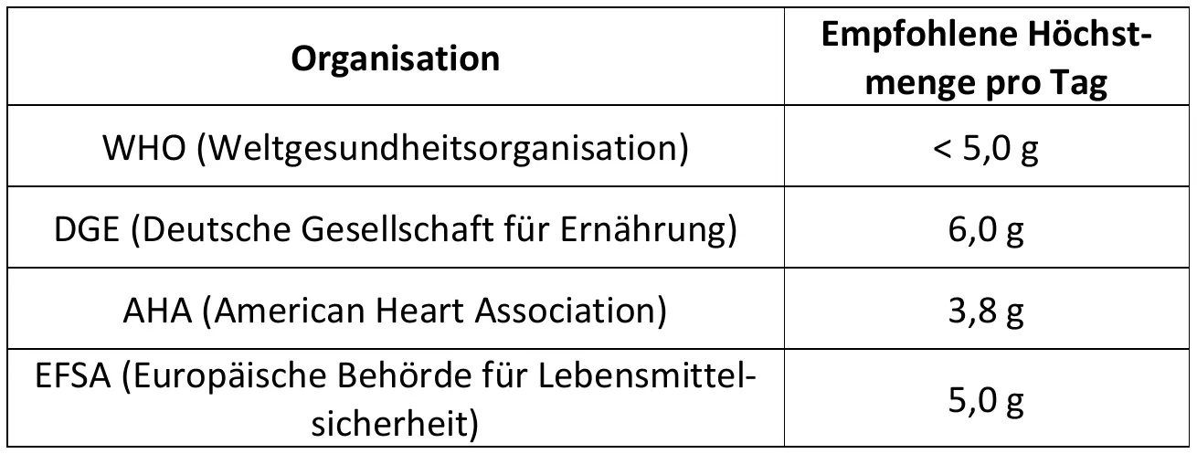 Empfehlungen zur maximalen täglichen Speisesalzzufuhr. Erwachsene und Kinder. Die Werte für Kinder stammen von der DGE. Die Empfehlungen der AHA und der WHO beziehen sich in den Originalquellen primär auf die Aufnahme von Natrium. Für diese Tabelle wurden die Werte in die entsprechende Menge Speisesalz (NaCl) umgerechnet. 4567