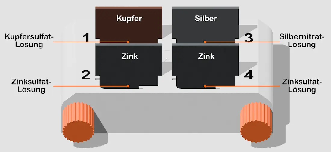 Man kann Spannungen immer nur als Gesamtunterschied der Potentiale zwischen zwei Halbzellen messen. Stellen wir uns vor, wir würden im Daniell-Element eine Halbzelle durch eine Halbzelle mit einem anderen Metall in seiner Metallsalz-Lösung austauschen.