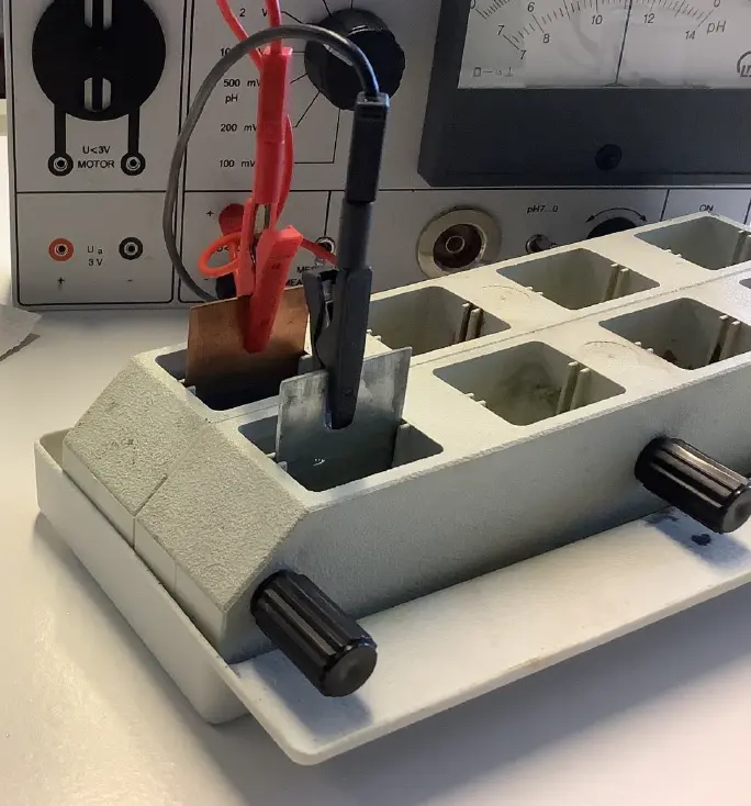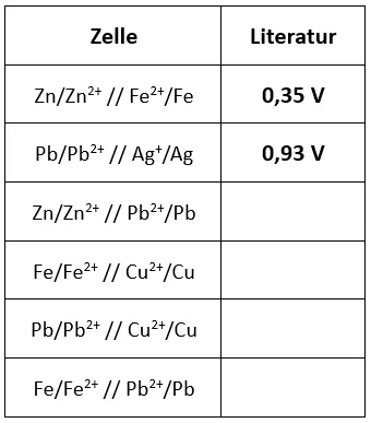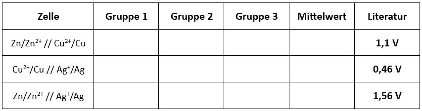 - Messen Sie die Zellspannung zwischen zwei Halbzellen, auch über Kreuz und notieren Sie ihre Messwerte tabellarisch gemäß der Vorlage unter Beobachtung.