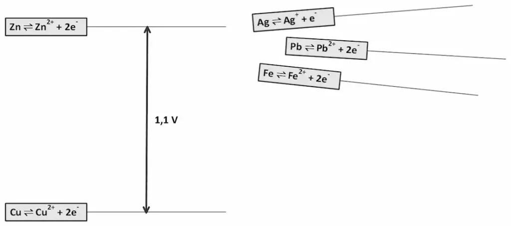 - Wählen Sie Redoxpaare aus der Redoxreihe der Metalle aus und legen Sie hypothetisch dar, welche Veränderungen der Spannung im Vergleich zum Daniell-Element (Zn/Zn2+ // Cu2+/Cu) Sie erwarten würden. Nutzen Sie in ihrer Argumentation auch Fachbegriffe: Potential, Lösungstension, elektrochemische Doppelschicht.