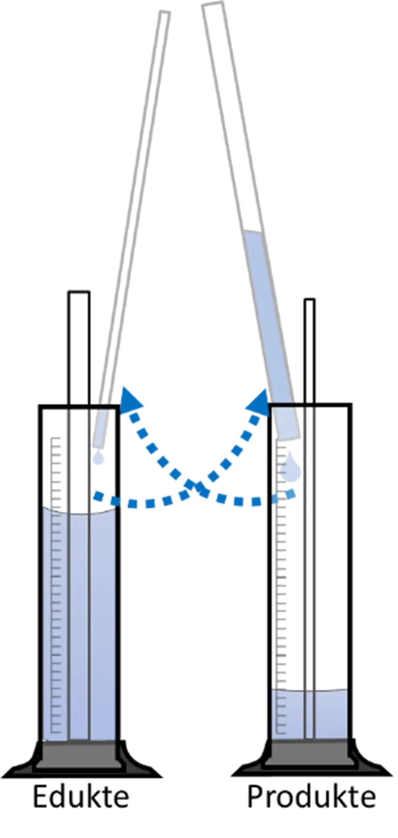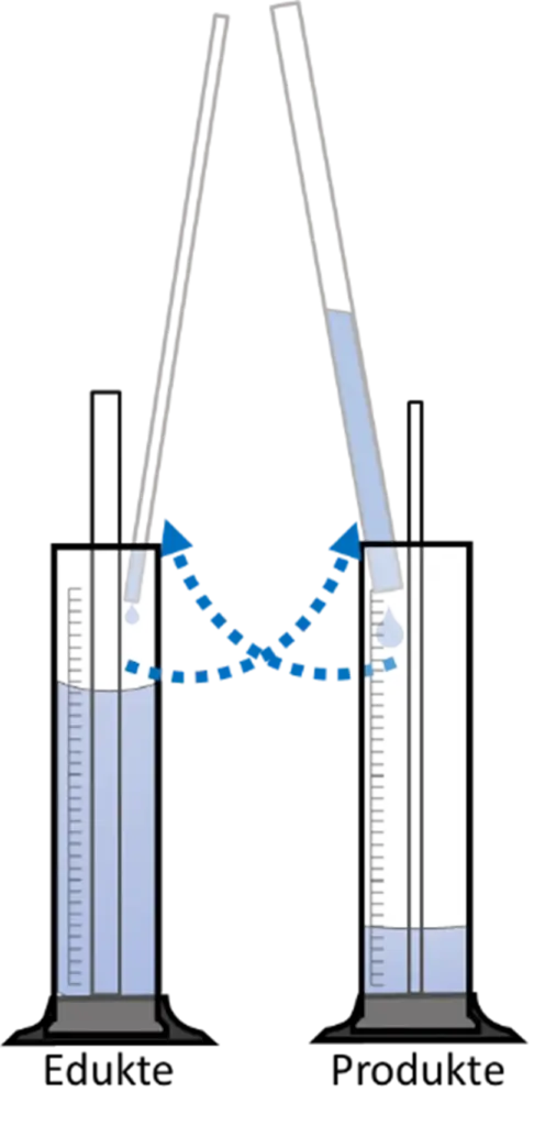 - Gleichzeitig(!) wird 20 Mal mit dem zweiten Glasrohr die Flüssigkeit vom zunächst leeren Messzylinder „Produkte“ in den Messzylinder „Edukte“ befördert.