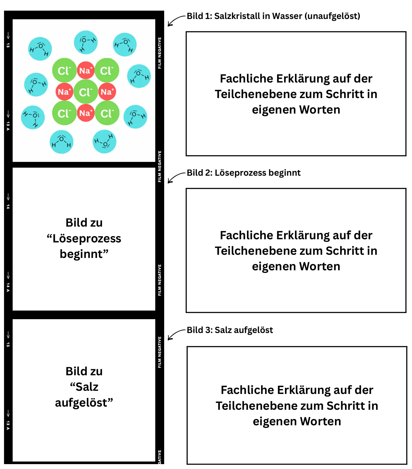 1. Stelle den Prozess des Auflösens eines Natriumchlorid-Kristalls (NaCl (s)) auf der Teilchenebene in Form einer Filmleiste dar.