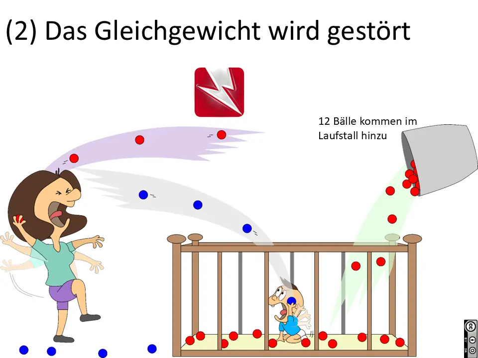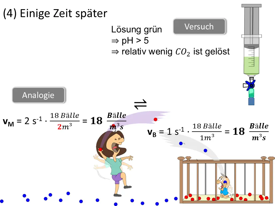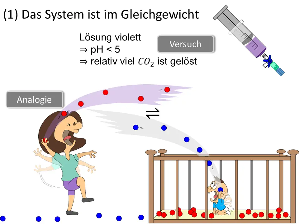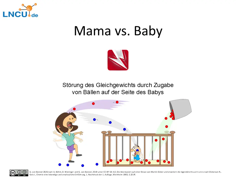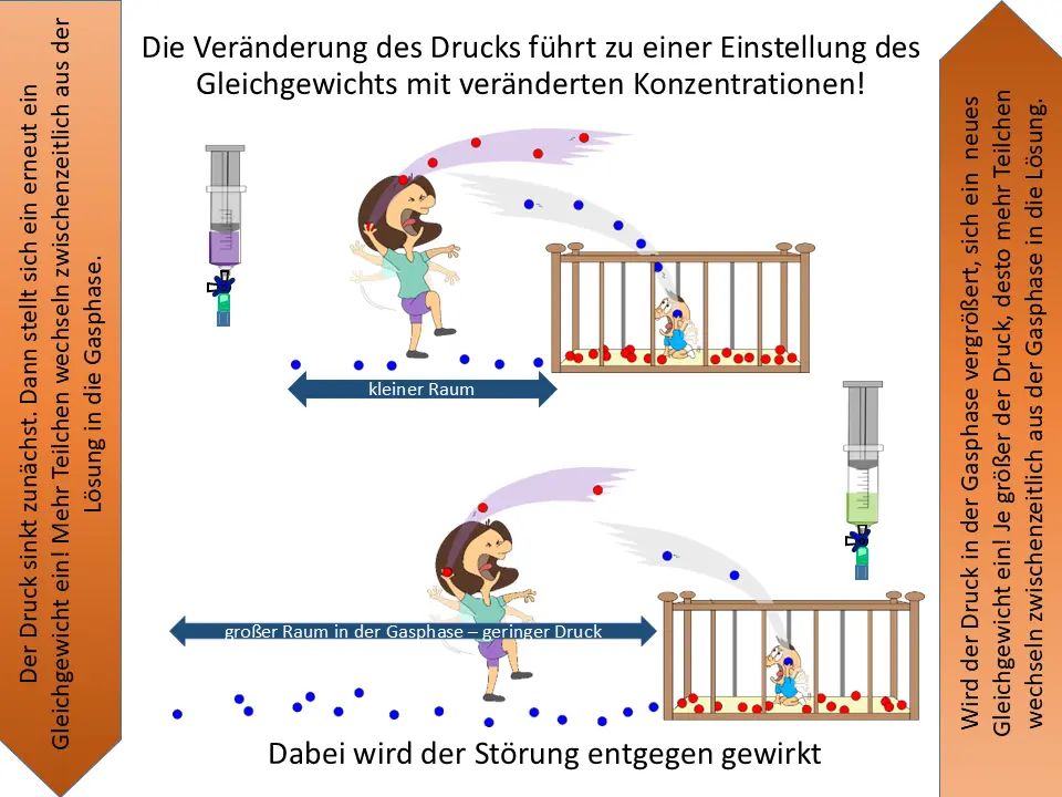 Wir können auch das Volumen des Raumes bei Mama vergrößern (oder verkleinern). Das simuliert eine Druckänderung und damit eine Konzentrationsänderung in einer Gasphase (Mama) über eine wässrigen Phase (Baby).