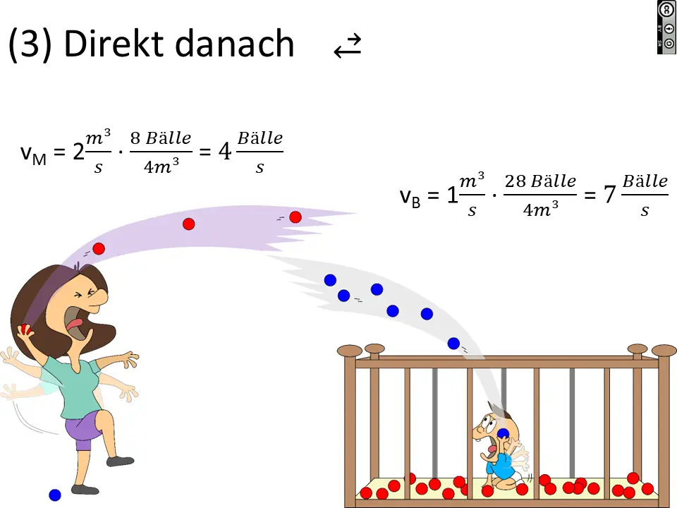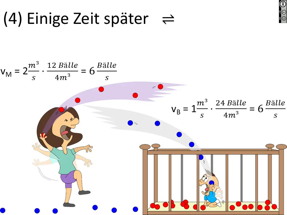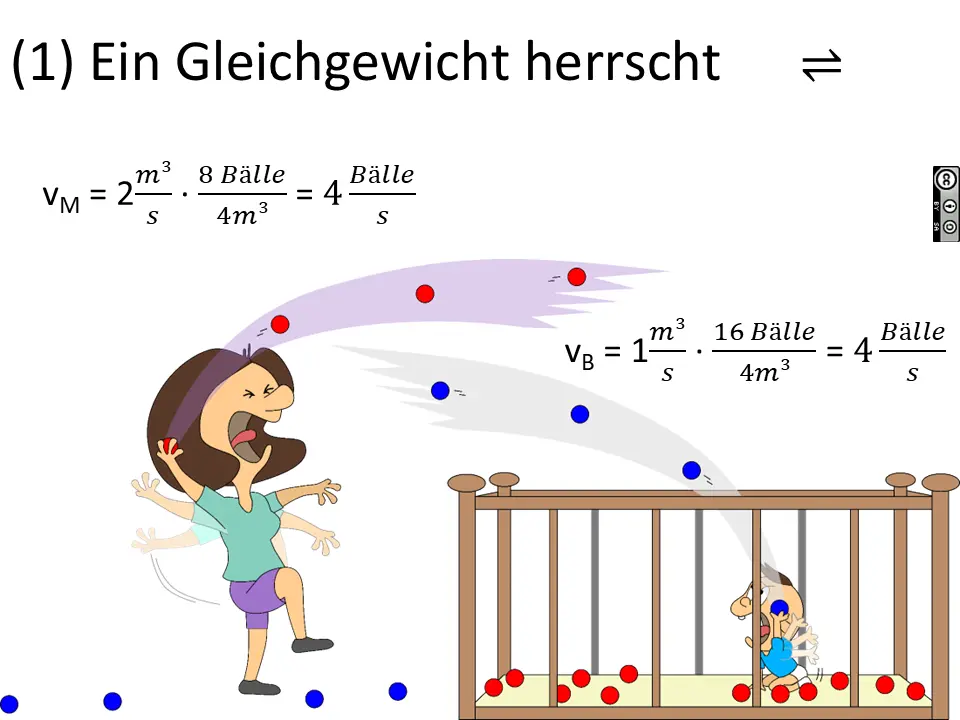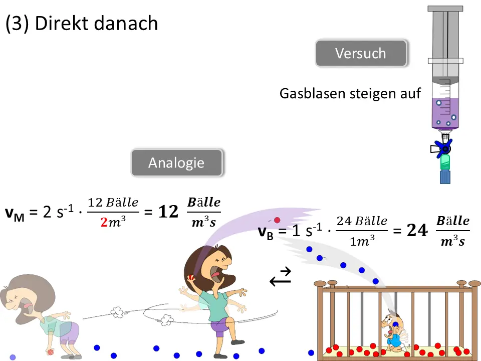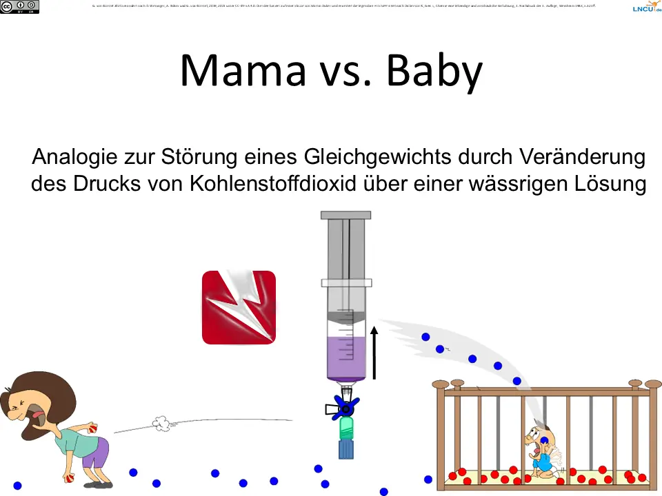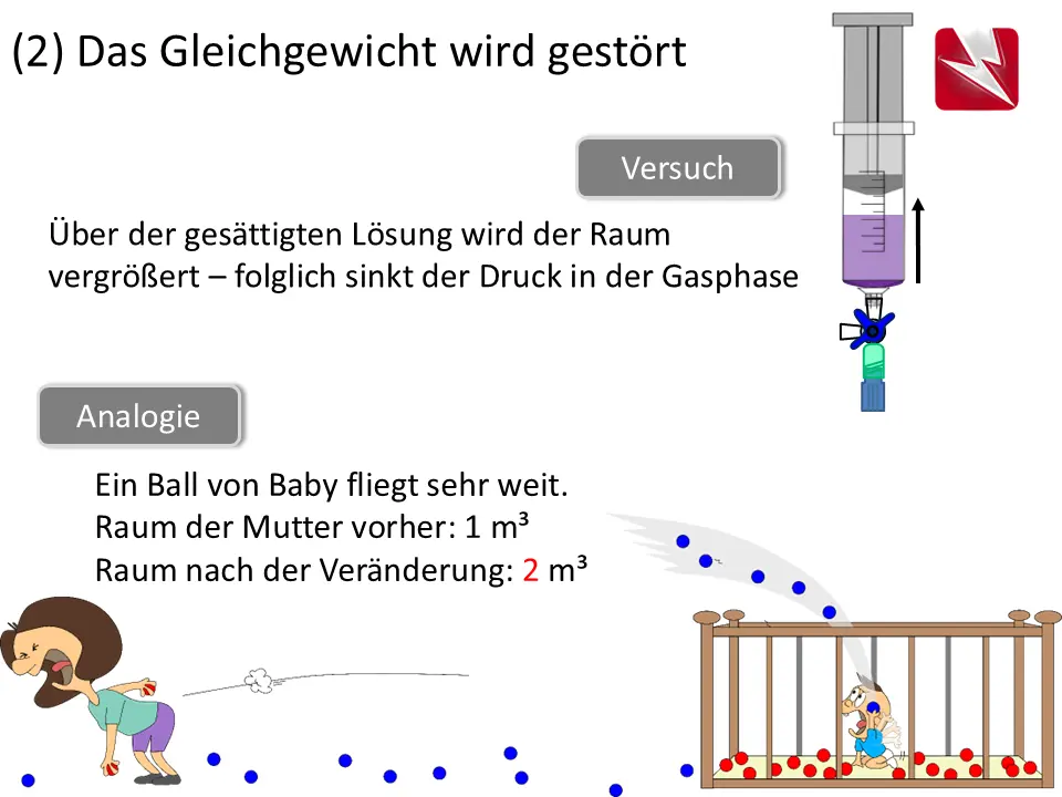 Wir können auch das Volumen des Raumes bei Mama vergrößern (oder verkleinern). Das simuliert eine Druckänderung und damit eine Konzentrationsänderung in einer Gasphase (Mama) über eine wässrigen Phase (Baby).