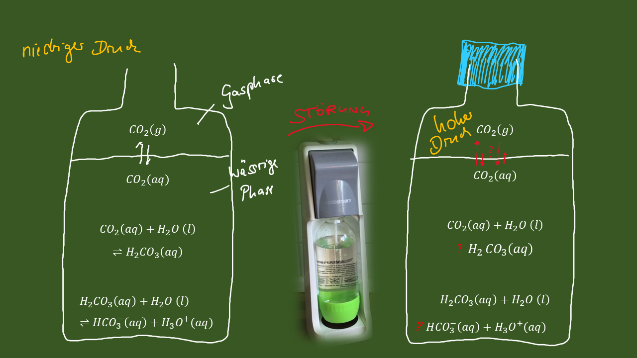 - Erklären Sie, was beim Sprudelvorgang in einem „Sodastreamer“ passiert. Gehen Sie davon aus, dass die rechte Skizze die Flasche direkt nach der Störung eines Gleichgewichts durch Zugabe von Kohlenstoffdioxid zeigt. Vervollständigen Sie die Schemazeichnung mit geeigneten Pfeilen.
