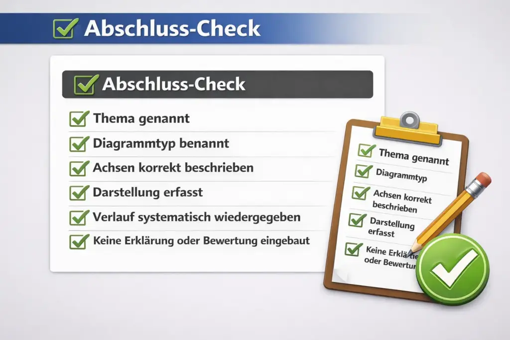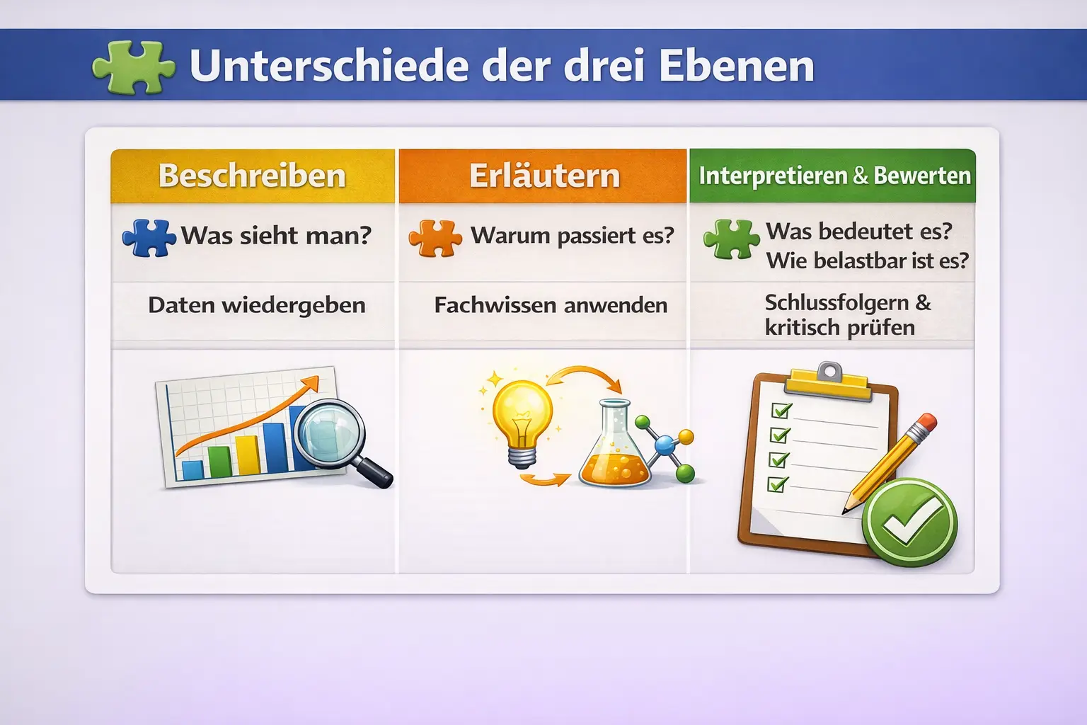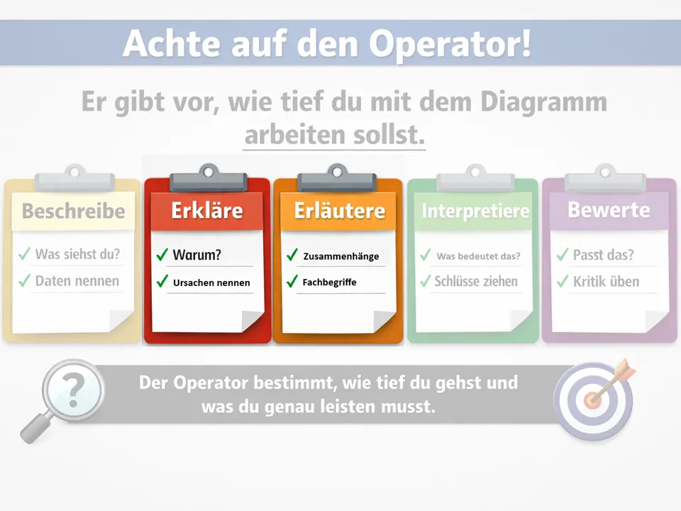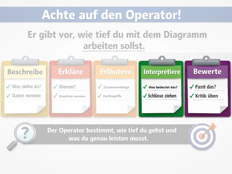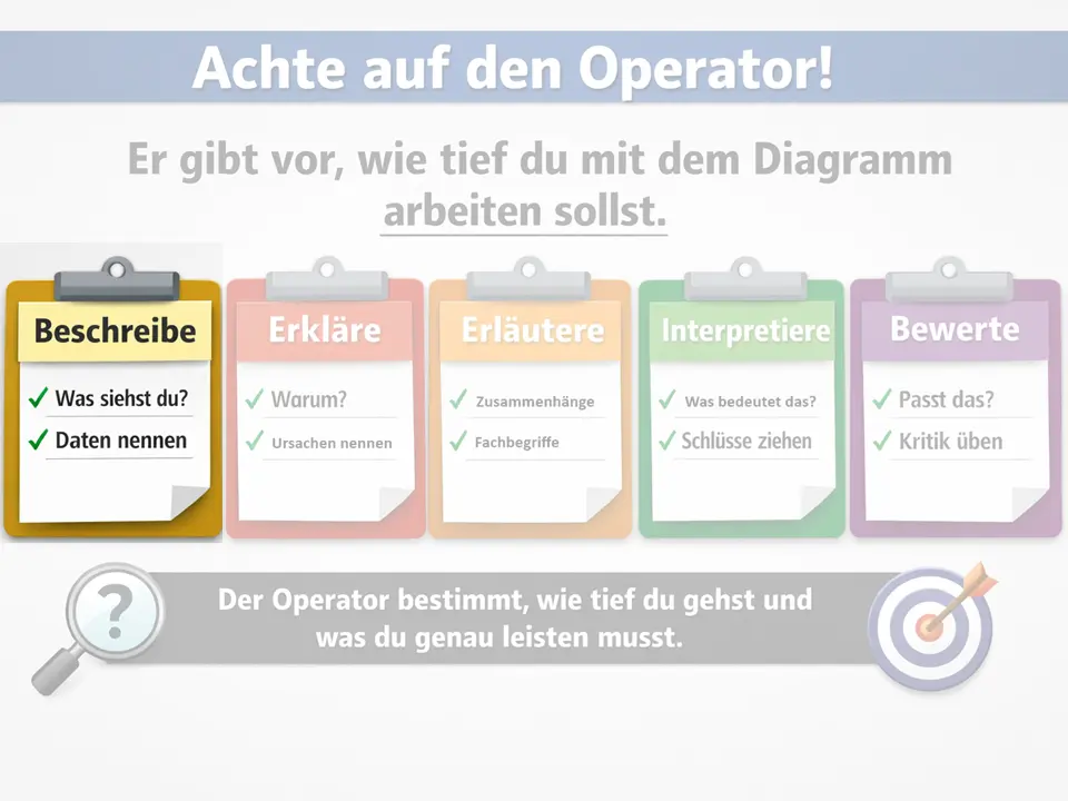 Achte genau auf den Operator in der Aufgabenstellung (z. B. beschreiben, erklären, erläutern, interpretieren, analysieren oder bewerten), denn er legt fest, wie tiefgehend du mit dem Diagramm arbeiten und was genau du leisten sollst.