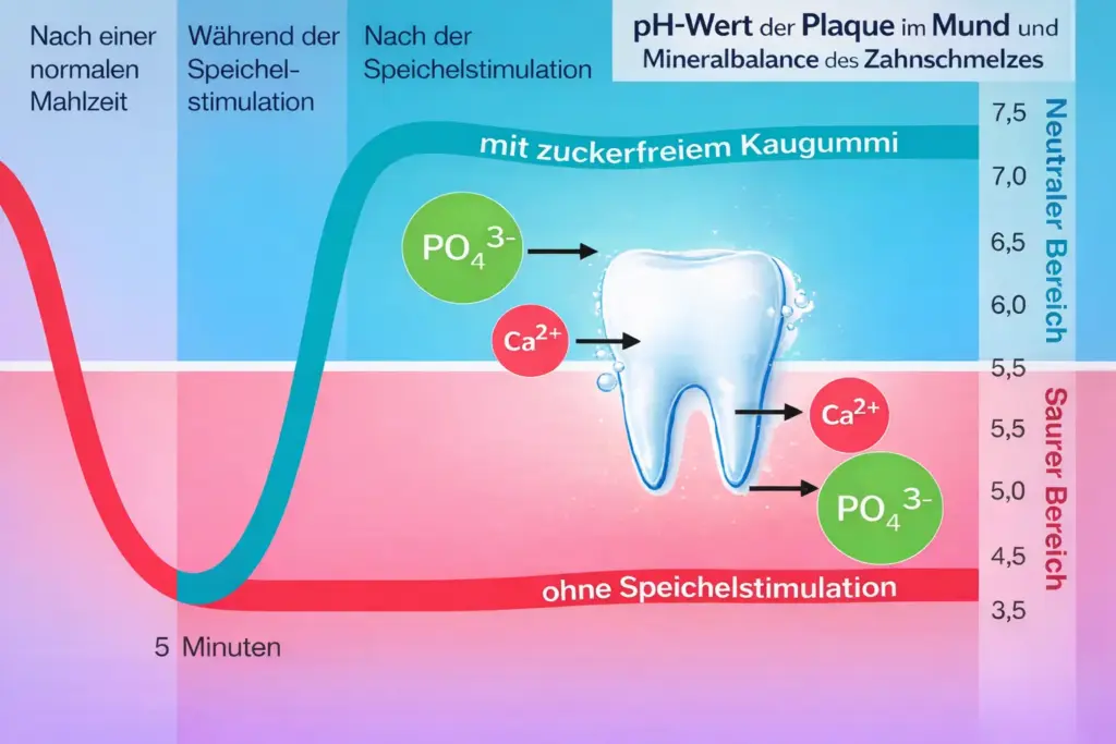 Nach der Mahlzeit fällt der pH-Wert in beiden Fällen zunächst deutlich ab und erreicht nach wenigen Minuten ein Minimum. Ohne Speichelstimulation verbleibt der pH-Wert länger im unteren Bereich. Mit zuckerfreiem Kaugummi steigt der pH-Wert hingegen schneller wieder an und überschreitet den Bereich oberhalb von 5,5 früher.