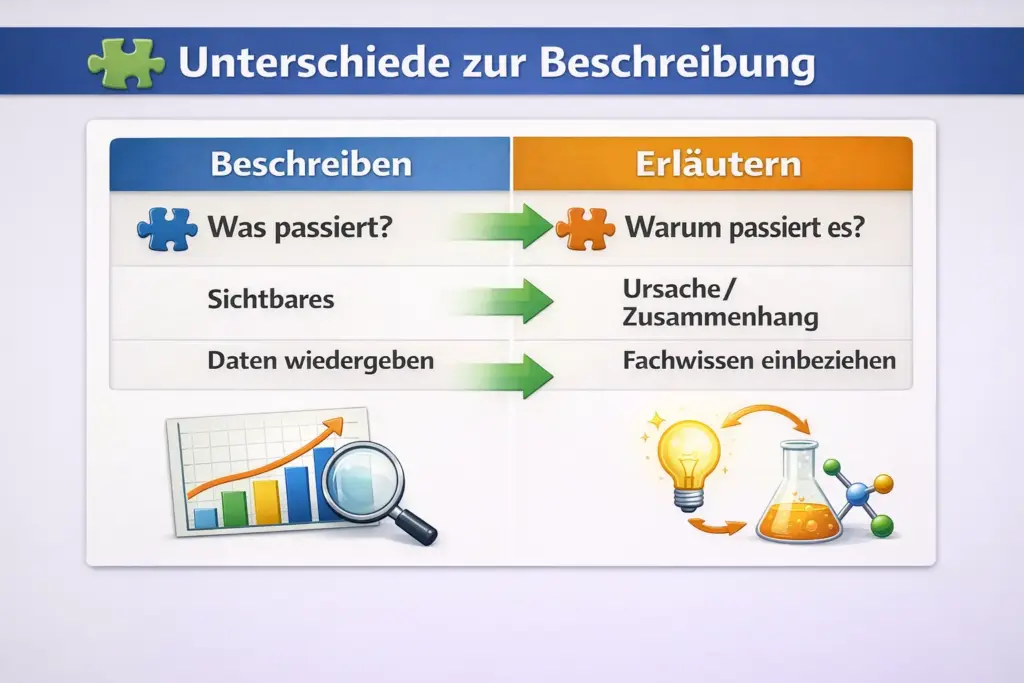 Beim Erläutern verknüpfst du die beobachteten Verläufe mit fachlichem Wissen. Du beantwortest z. B. die Fragen: