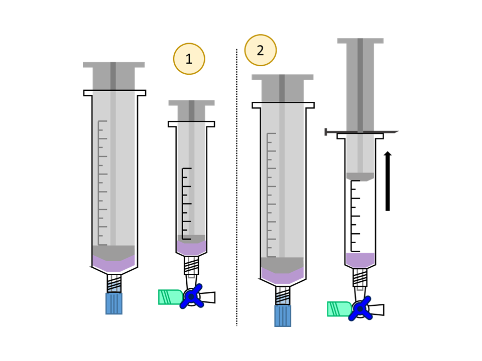 - Verbinden Sie die Spritzen erneut über den 3-Wegehahn und geben Sie aus der 30 mL Spritze ca. 2 mL der gefärbten Lösung zurück in die 12 mL Spritze.