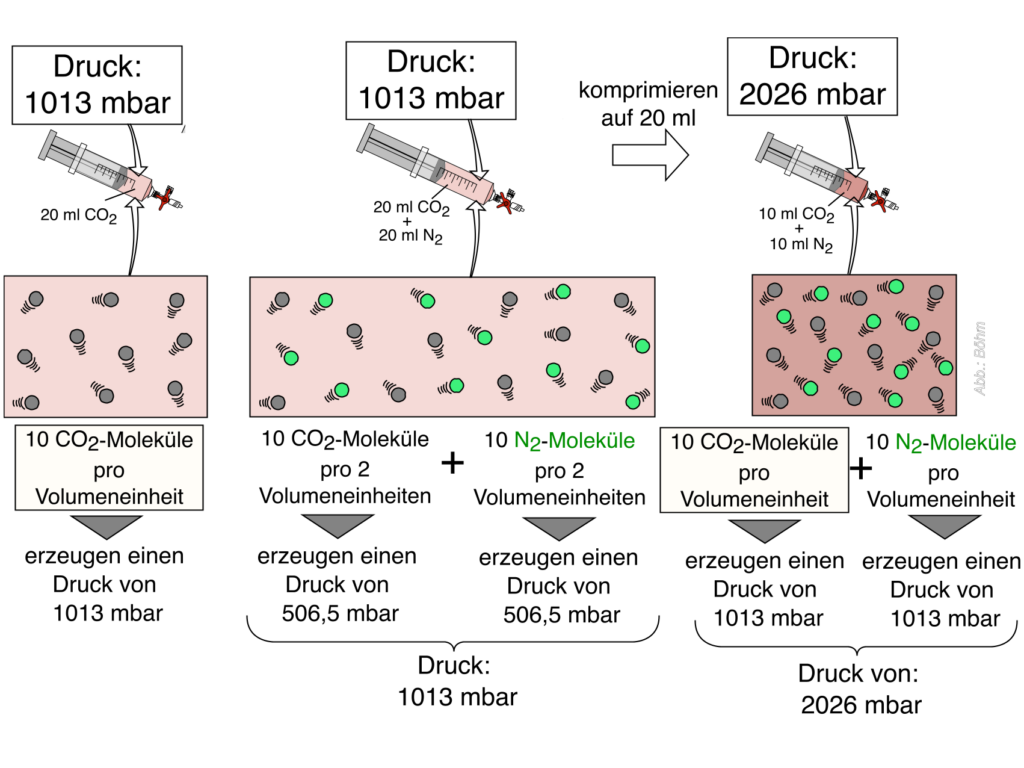 Der Druck in Gasen hängt aber zugleich davon aber, wie viele Teilchen sich in einem bestimmten Volumen befinden.