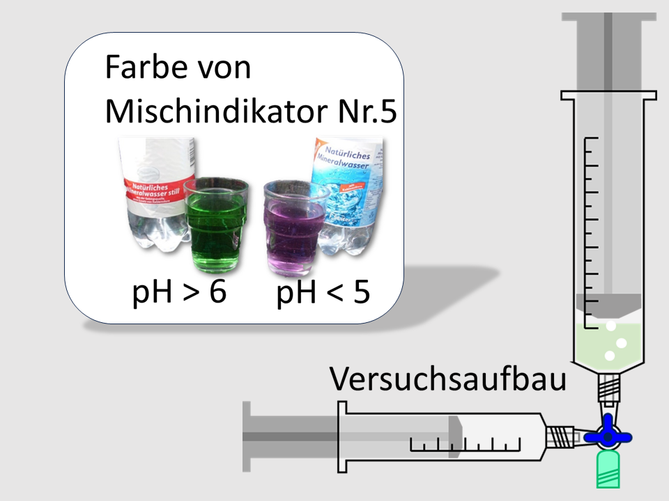 - Beobachten Sie, ob sich das Volumen des Gases Kohlenstoffdioxid verringert oder es zu einem Farbwechsel der wässrigen Lösung mit Indikator kommt.