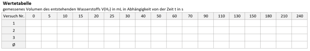 4. Erstellen Sie aus den Messwerten ein Volumen (V)–Zeit (t)–Diagramm, in welchem Sie die Entstehung des Wasserstoffs (V(H2) in mL) mit der Zeit (t in s) darstellen.