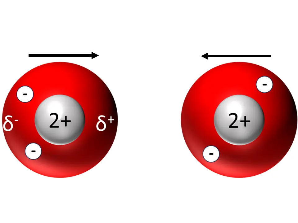 Der temporäre Dipol im Atom links sorgt bei Annäherung dafür, dass in einem Nachbaratom rechts ebenfalls kurzzeitig ein Dipol entsteht. Beide Atome ziehen sich nun kurzzeitig an.