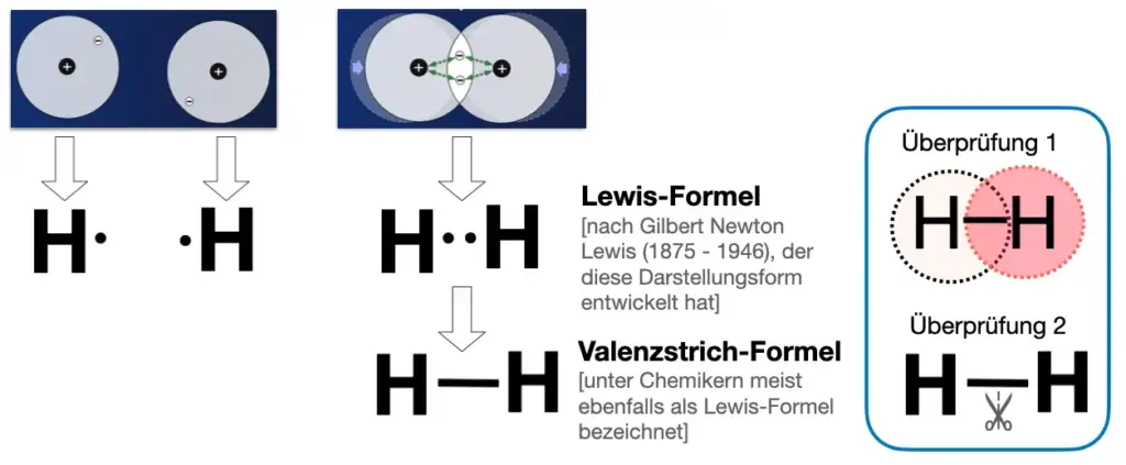Um ein Wasserstoffatom und ein Wasserstoffmolekül nicht jedesmal mit überlappenden Schalen zeichnen zu müssen (was bei Atomen mit mehr Schalen und mehr Elektronen noch aufwendiger wäre), verwendet man die sogenannten Valenzstrich-Formeln bzw. Lewis-Formeln. (Die Begriffe werden oft synonym verwendet.)