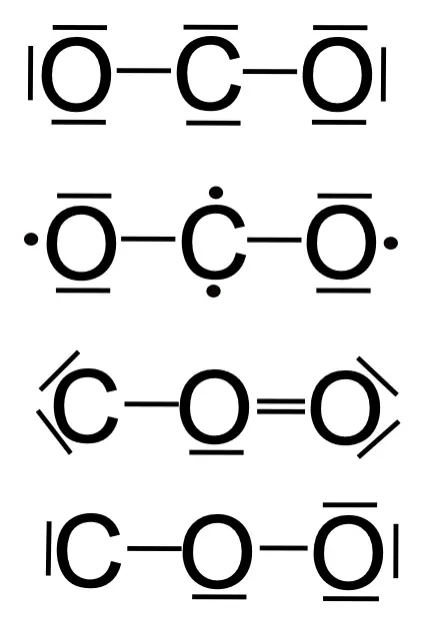 - In Abb. 10 sind vier falsche Lewis-Formeln für das CO2-Molekül dargestellt. Erkläre, was genau an den Lewis-Formeln falsch ist.