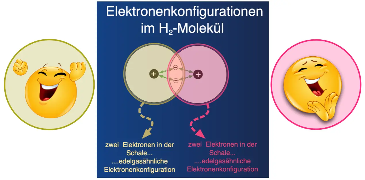 Eine letzter Aspekt: Wenn Atome Ionen bilden, erreichen sie durch das Abgeben bzw. Aufnehmen von Elektronen eine edelgasähnliche Elektronenkonfiguration. Wenn man sich die Schalen der Wasserstoffatome im H2-Molekül ansieht, stellt man fest, dass durch das Knüpfen der Elektronenpaarbindung beide Atome im Molekül eine edelgasähnliche Elektronenkonfiguration erhalten.