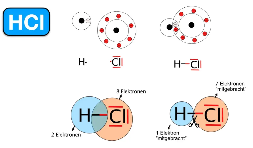 Klar…und da die Atomkerne von beiden Elektronen angezogen werden, bleiben sie in dieser Konstellation zusammen, die Atome sind also verbunden. Da es zwei Elektronen im Überlappungsbereich sind, die die Atome zusammenhalten, spricht von einer Elektronenpaarbindung. Ein andere Bezeichnung lautet „kovalente Bindung“, weil zwei Valenzschalen Elektronen gemeinsam „nutzen“.