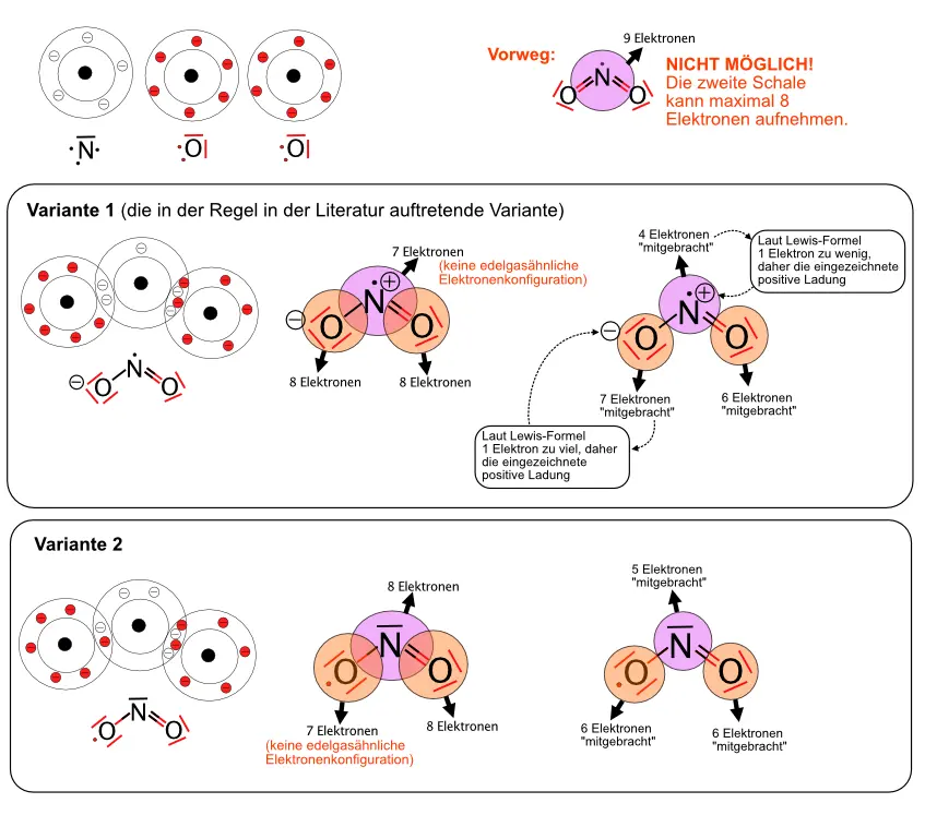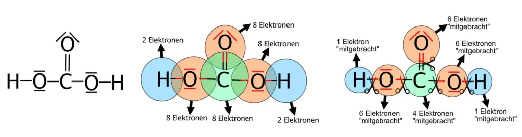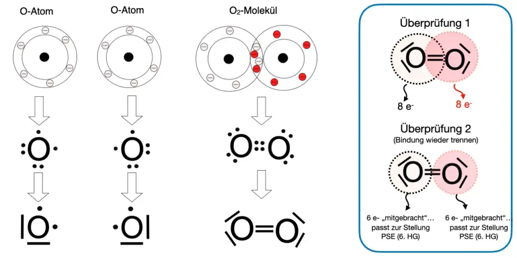 Mit den beiden Überprüfungsschritten kannst Du testen, ob in der gezeichneten Lewis-Formel die äußeren Schalen nicht mehr Elektronen enthalten, als sie aufnehmen können und ob jedes Atom die Anzahl an Elektronen „mitgebracht“ hat, die der Position des Elementes im Periodensystem entspricht.