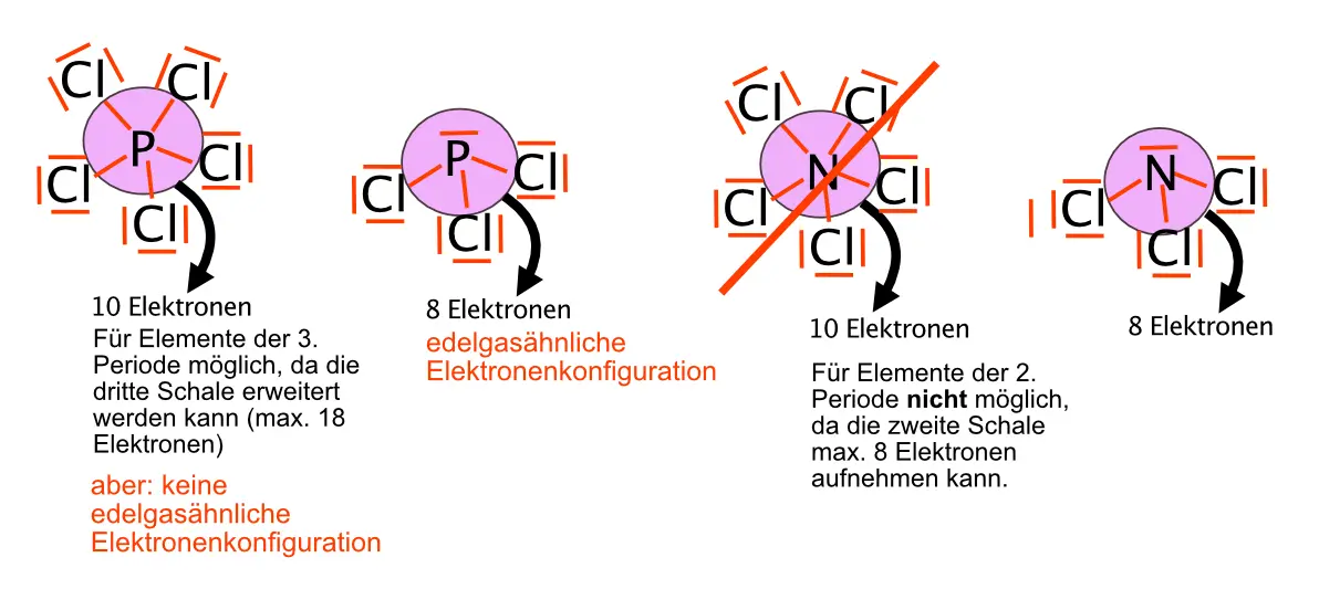 - Aus Phosphor und Chlor lassen sich PCl3 und PCl5 herstellen. Eine Verbindung mit der Verhältnisformel NCl5 existiert dagegen nicht, NCl3 lässt sich herstellen. Erkläre mit Hilfe der Lewis-Formeln.