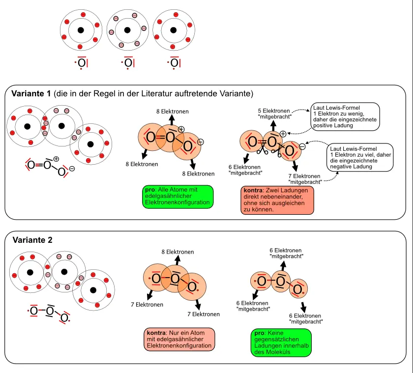 O3-Moleküle sind sehr reaktiv. Die gebräuchliche Lewisformel ist die als Variante 1 dargestellte.6