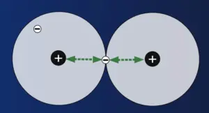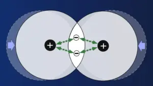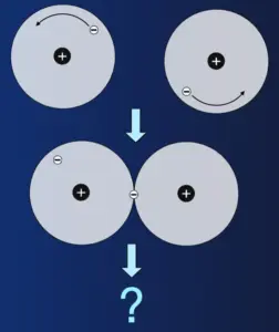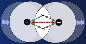 Wenn die Atome sich berühren, gelangen über kurz oder lang die Elektronen während ihrer Bewegungen um den Atomkern in den Bereich, in dem sie auch der Anziehungskraft des benachbartem Atomkerns ausgesetzt sind. In der Abbildung ist das für das Elektron des rechten Atoms dargestellt.