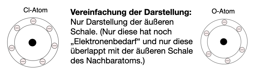 - Zeichne ein Cl2-Molekül und ein O2-Molekül, indem Du in einer vereinfachten Darstellung die Verteilung der Elektronen in den äußeren Schalen darstellst. (Eine Musterdarstellung findest Du in den Hinweisen. s.u.)
