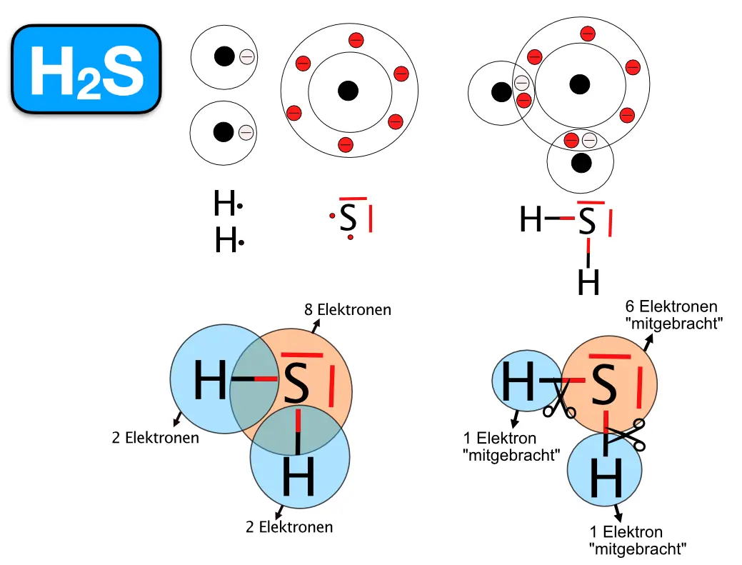 Eine letzter Aspekt: Wenn Atome Ionen bilden, erreichen sie durch das Abgeben bzw. Aufnehmen von Elektronen eine edelgasähnliche Elektronenkonfiguration. Wenn man sich die Schalen der Wasserstoffatome im H2-Molekül ansieht, stellt man fest, dass durch das Knüpfen der Elektronenpaarbindung beide Atome im Molekül eine edelgasähnliche Elektronenkonfiguration erhalten.