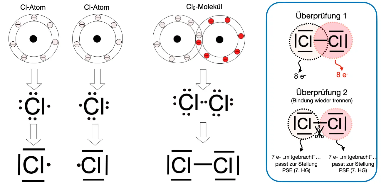 Mit den beiden Überprüfungsschritten kannst Du testen, ob in der gezeichneten Lewis-Formel die äußeren Schalen nicht mehr Elektronen enthalten, als sie aufnehmen können und ob jedes Atom die Anzahl an Elektronen „mitgebracht“ hat, die der Position des Elementes im Periodensystem entspricht.