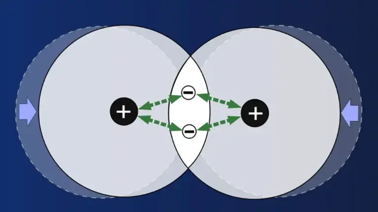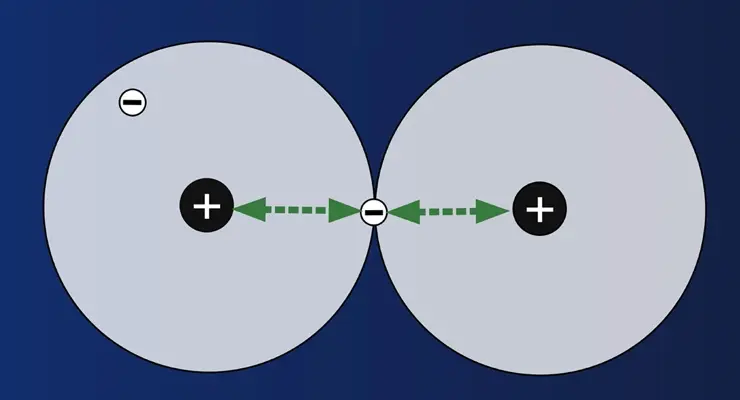 Wenn die Atome sich berühren, gelangen über kurz oder lang die Elektronen während ihrer Bewegungen um den Atomkern in den Bereich, in dem sie auch der Anziehungskraft des benachbartem Atomkerns ausgesetzt sind. In der Abbildung ist das für das Elektron des rechten Atoms dargestellt.