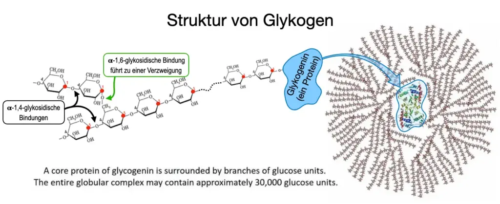 Die Haupt-Glucosepeicher im menschlichen Körper befinden sich in der Leber und in den Muskeln. Glucose wird hier allerdings nicht in monomerer Form, sondern in Form von Glykogen, einem stark verzweigten Polymer (Abb. 7) gespeichert. Beim Abbau des Glykogens zur Freisetzung von Glucose werden an den vielen 4′-Enden Glucose-Einheiten enzymatisch abgespalten. Wegen der Vielzahl an 4′-Enden ist eine sehr schnelle Freisetzung von großen Glucose-Mengen möglich.