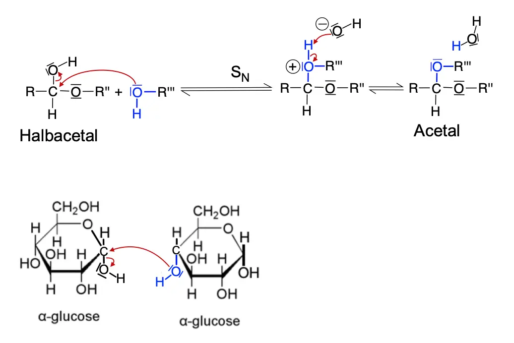 - Erläutern Sie, wie Bildung eines Acetalmoleküls abläuft (mit Strukturformeln/ Welches Atom greift warum wo an?) und übertragen Sie ihre Erkenntnisse auf die Bildung eines Maltose-Moleküls aus zwei Glucosemolekülen.