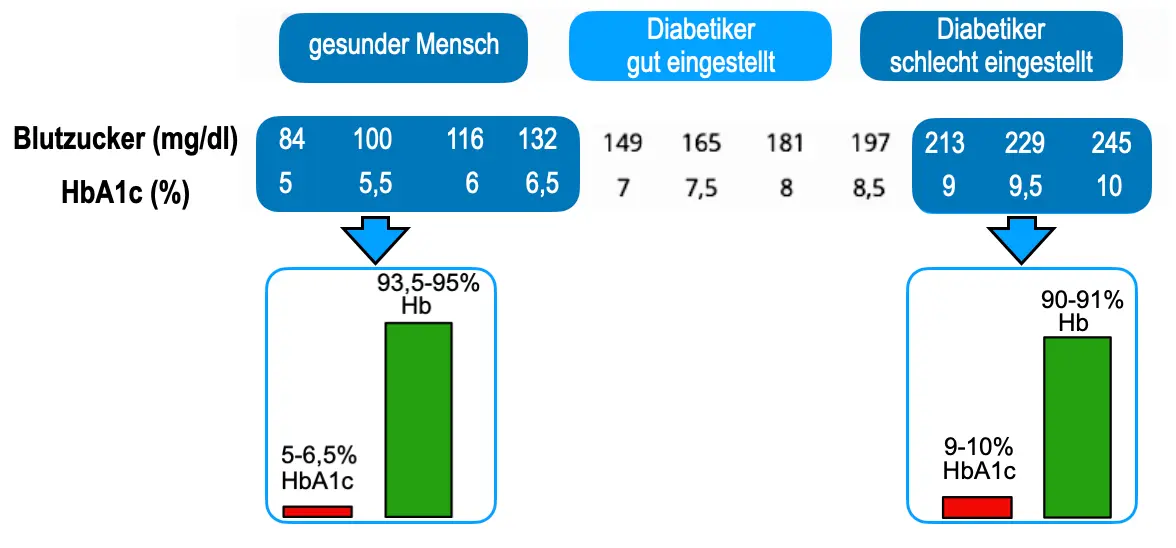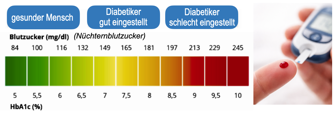 Der Blutzuckerspiegel (Glucose-Konzentration im Blut) wird vom menschlichen Körper über die Hormone Insulin und Glukagon reguliert. Eine Unterzuckerung (Hypoglykämie; Blutzuckerspiegel <70 mg/dl) kann zu Nervosität, Verwirrtheit oder gar zur Bewusstlosigkeit führen, da das Gehirn nicht mit ausreichend Energie versorgt wird. Eine häufige Überzuckerung (Hyperglykämie) führt langfristig u.a. zu Schädigungen der Blutgefäße und erhöht damit das Risiko für z.B. einen Herzinfarkt oder Schlaganfall. Der aktuelle Blutzuckerspiegel kann mit Blutzuckermessgeräten schnell ermittelt werden. Um die Höhe des Blutzuckerspiegels in den letzten 2-3 Monaten zu beurteilen, hilft der sogenannte HbA1c-Wert, der auch als Langzeit-Blutzuckerwert bezeichnet wird.