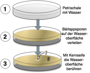 Eine Petrischale wird mit Wasser befüllt (1). Anschließend werden Bärlappsporen auf der Wasseroberfläche verteilt. Bärlappsporen sind hydrophob und haben eine geringere Dichte als Wasser. Daher bleiben sie auf der Wasseroberfläche liegen (2). Anschließend wird die Wasseroberfläche mit einem Stückchen Kernseife berührt (3).
