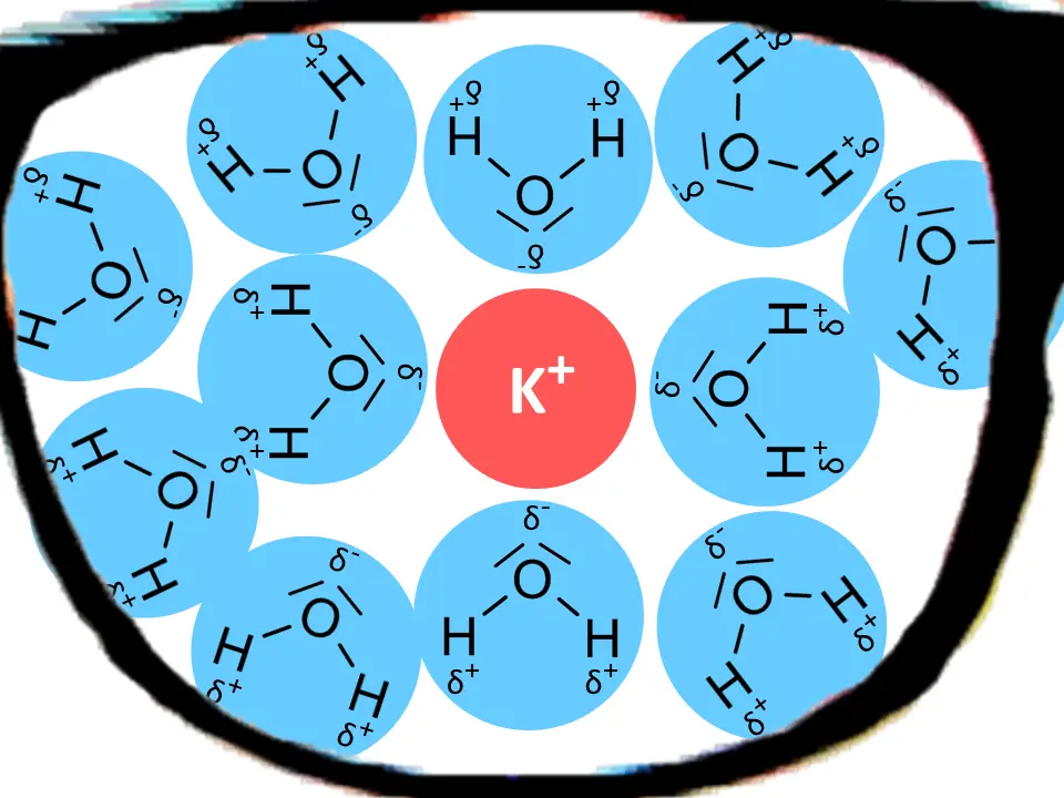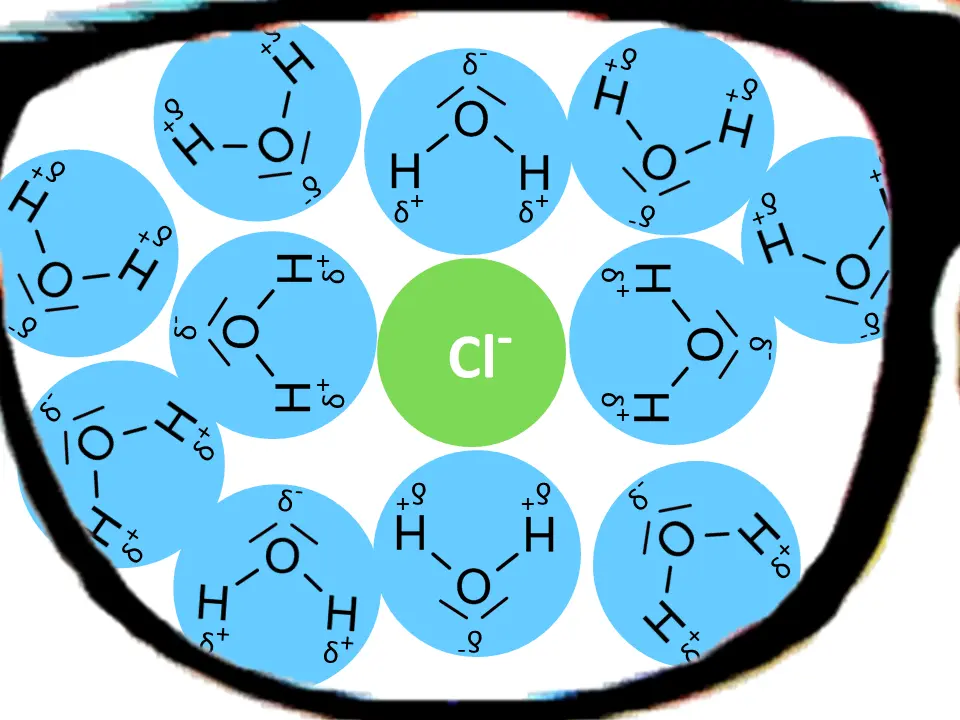 Ionen haben immer eine bestimmte Ladung. Sie werden daher in wässrigen Lösungen auf eine bestimmte Weise von Wasserteilchen umgeben.