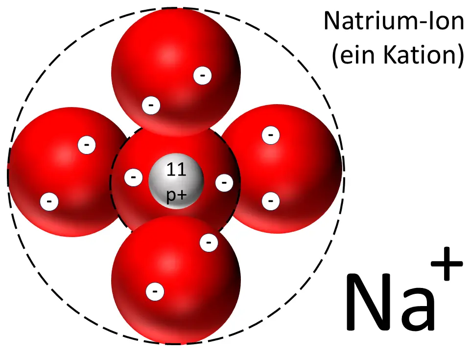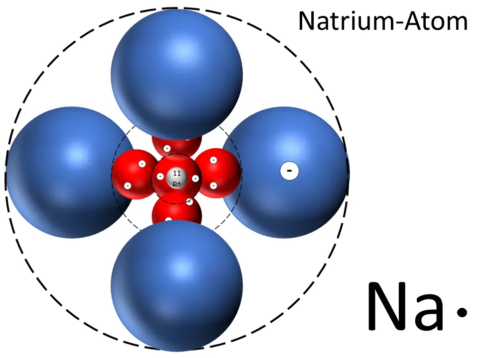 - Vergleiche ein Natrium-Atom (Na) mit einem Natrium-Ion (Na+) mithilfe der gegebenen Darstellungen im Kugelwolkenmodell in Galerie 3. Gehe dabei insbesondere auf die elektrische Ladung, die Anzahl der Valenzelektronen und die Größe ein.