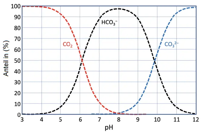 Bei pH-Werten kleiner als 4 liegt fast nur Kohlenstoffdioxid vor. Bei pH-Werten um die 8,2, also den Werten der vorindustriellen Zeit im Meerwasser, fast ausschließlich Hydrogencarbonat und bei deutlich höheren pH-Werten fast ausschließlich Carbonat.