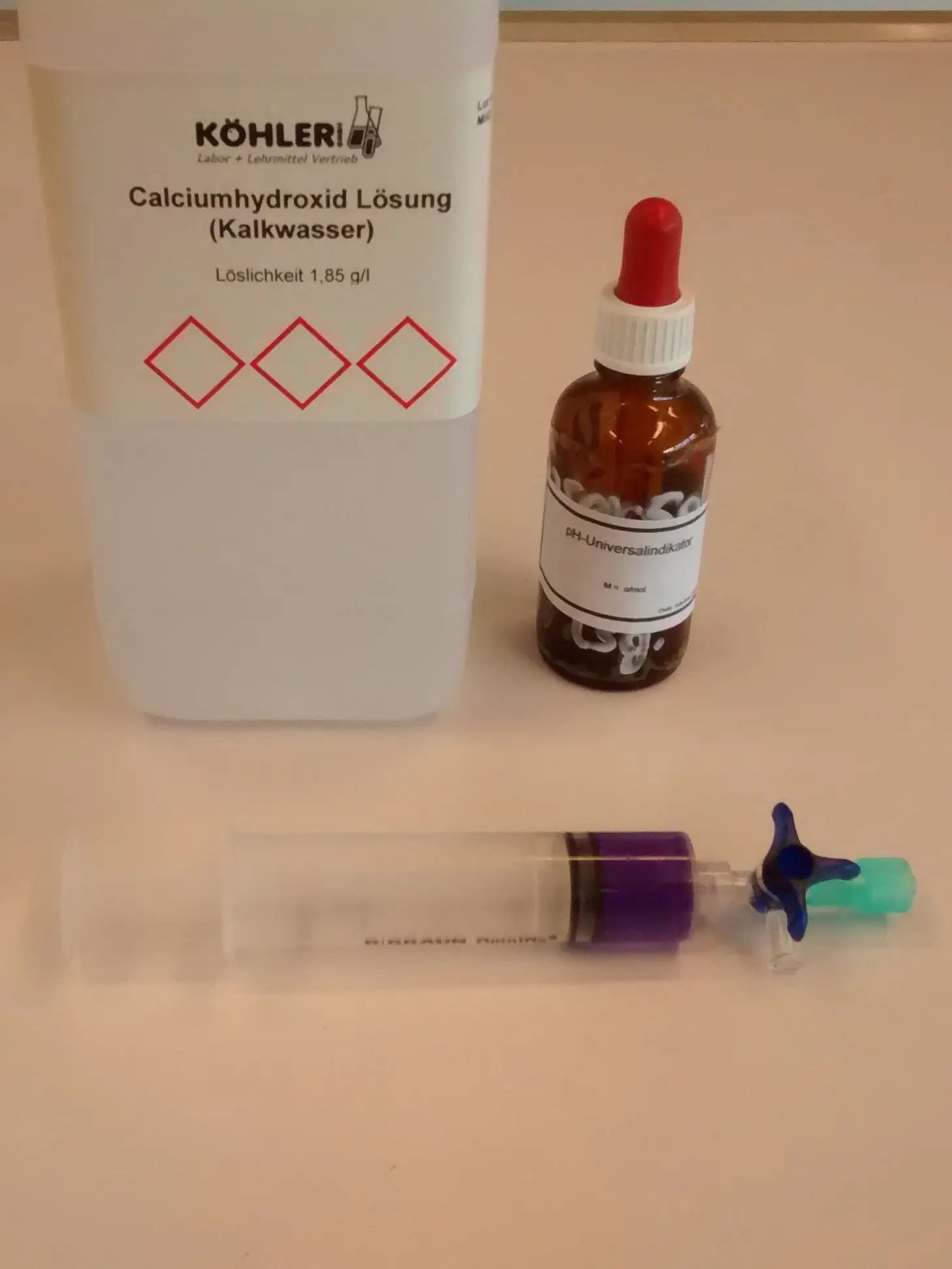 - Die Calciumhydroxid-Lösung wird mit wenigen Tropfen Universalindikator eingefärbt.