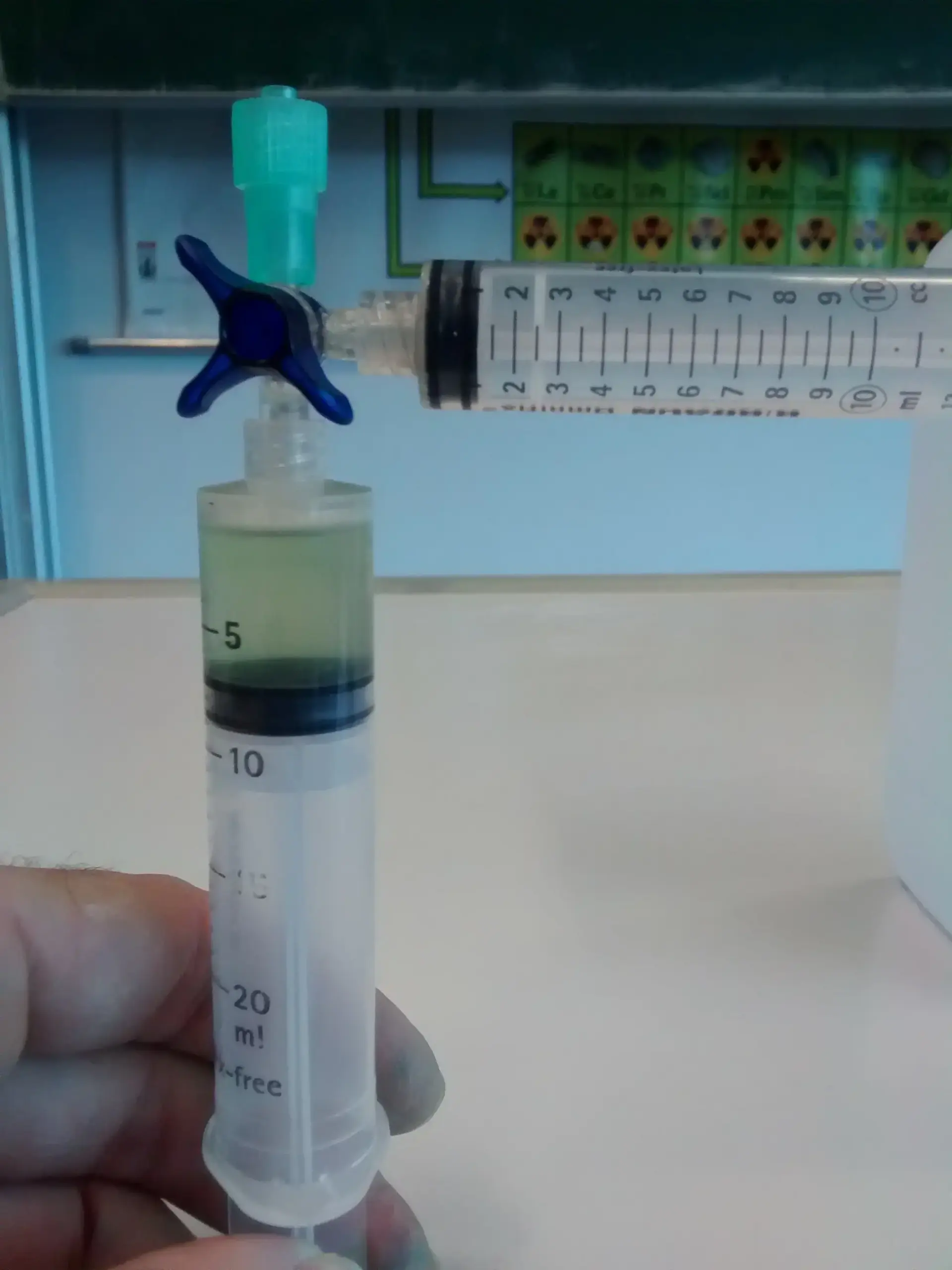 - Eine 12 mL Spritze wird mit Kohlenstoffdioxid gefüllt und über den Dreiwegehahn mit der großen Spritze verbunden.