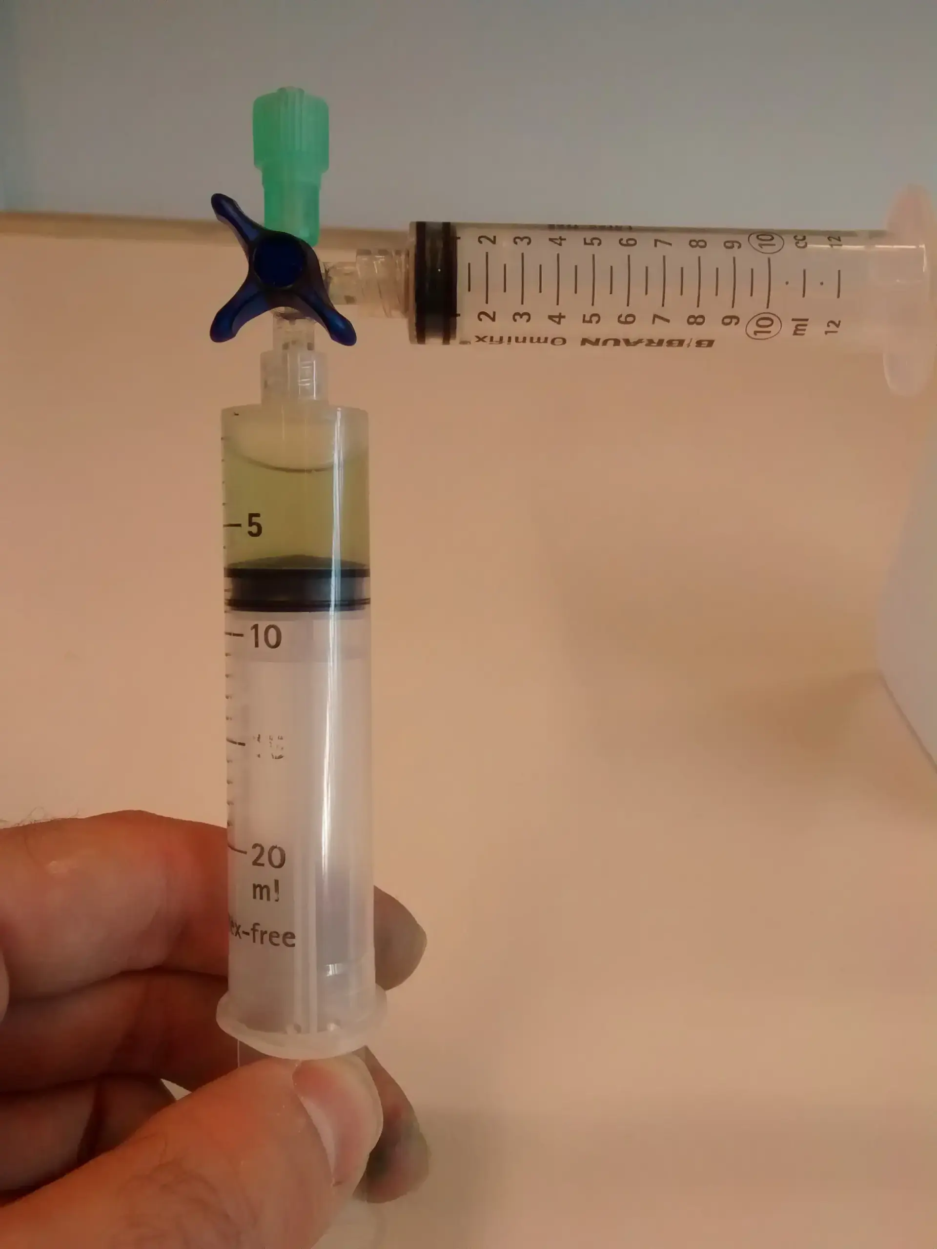 - 5 mL dieser Lösung werden in eine 30 mL Spritze aufgesaugt.
