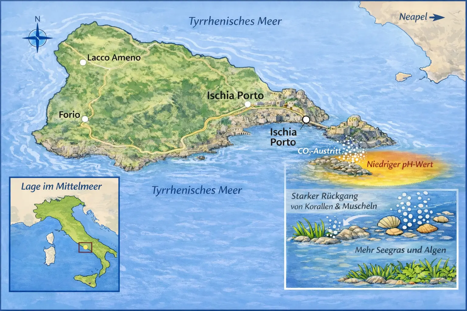 Vor der Insel Ischia, direkt beim Castello Aragonese, treten sogenannte CO2-Vents auf. Das sind natürliche Austrittsstellen, an denen Kohlendioxid aus vulkanisch aktiven Gesteinsschichten durch Spalten im Meeresboden ins Wasser gelangt. Das gelöste CO2 reagiert mit Wasser zu Kohlensäure. Dadurch sinkt der pH-Wert. In der Nähe der Vents ist dieser Effekt besonders stark, weiter entfernt nimmt er ab. Es entsteht also ein natürlicher pH-Gradient.