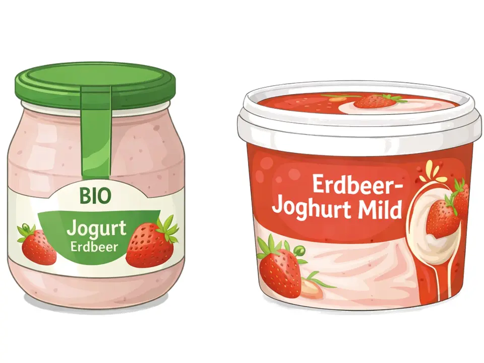 Du stehst im Supermarkt vor dem Kühlregal und möchtest einen Erdbeerjoghurt kaufen. Die zwei Produkte in Galerie 1 fallen dir besonders auf. Beide Produkte sehen ähnlich aus, schmecken laut Verpackung „fruchtig“ und sind in der Kühlung direkt nebeneinander platziert.