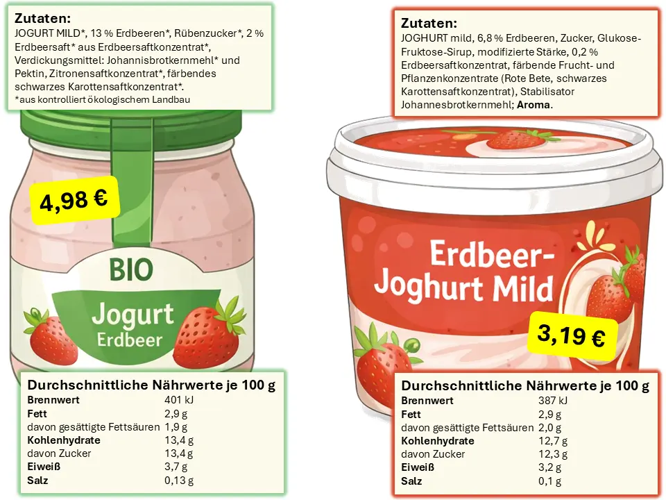- Die Preisunterschiede bei Erdbeerjoghurt sind deutlich.
