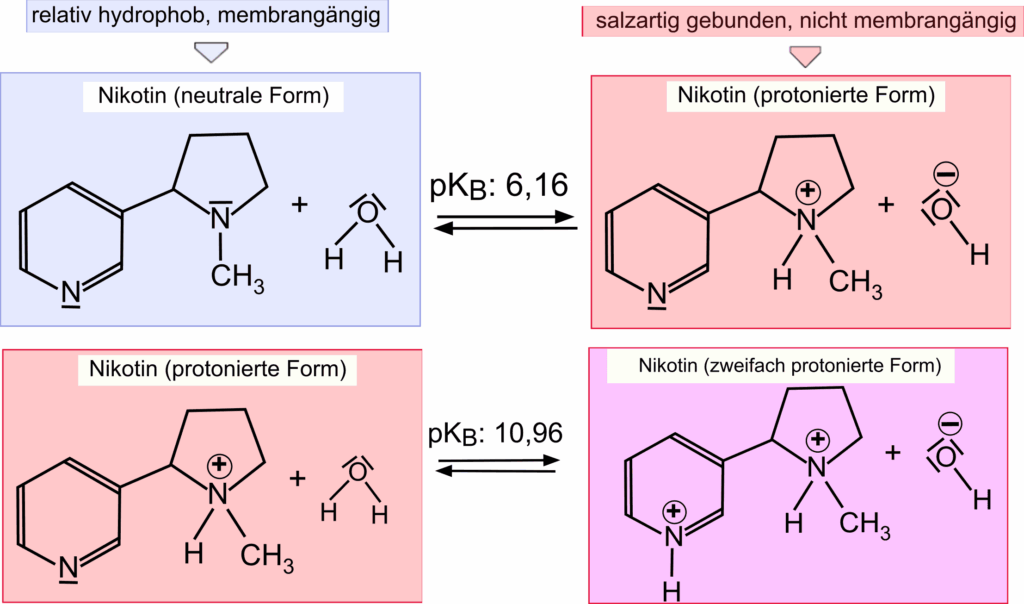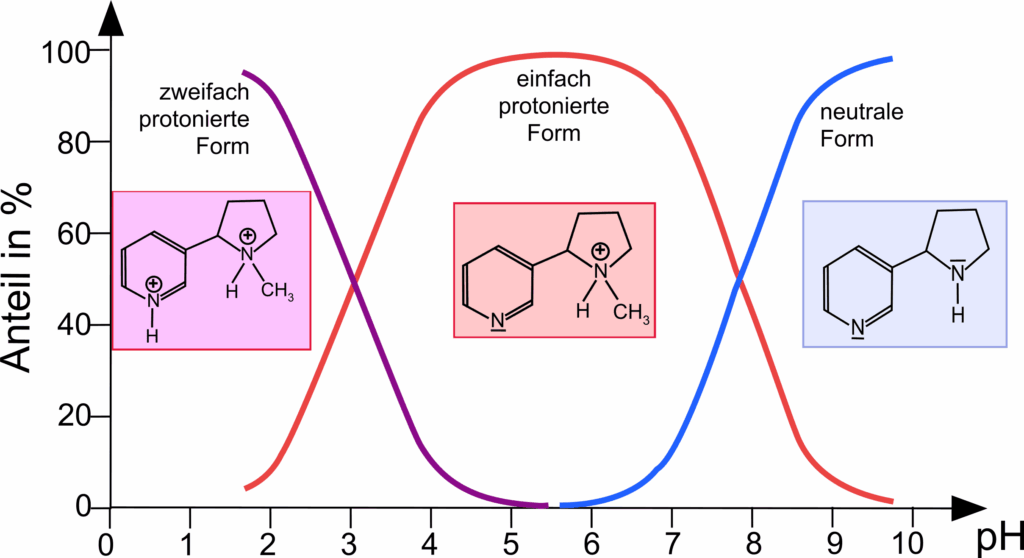 In welcher Form Nikotin im Tabak, im Rauch, im menschlichen Körper oder in wässrigen Lösungen vorliegt, hängt vom pH-Wert des umgebenden Milieus ab. Dies lässt sich mit Lösungen entsprechenden pH-Werts zeigen. Die Konzentration des Nikotins ist bei solchen Untersuchungen so klein, dass es selbst den pH-Wert dabei nahezu nicht verändert.