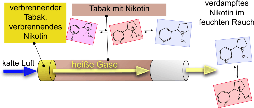 Im Tabak liegen die Moleküle in der Regel in protonierter Form als Kationen in Salzen gebunden vor. Sollen Nikotinmoleküle beim Rauchen ins Blut gelangen, müssen sie zunächst in der Zigarette verdampfen und vom Rauchstrom mitgerissen werden, bevor sie verbrennen und damit zerstört wären.