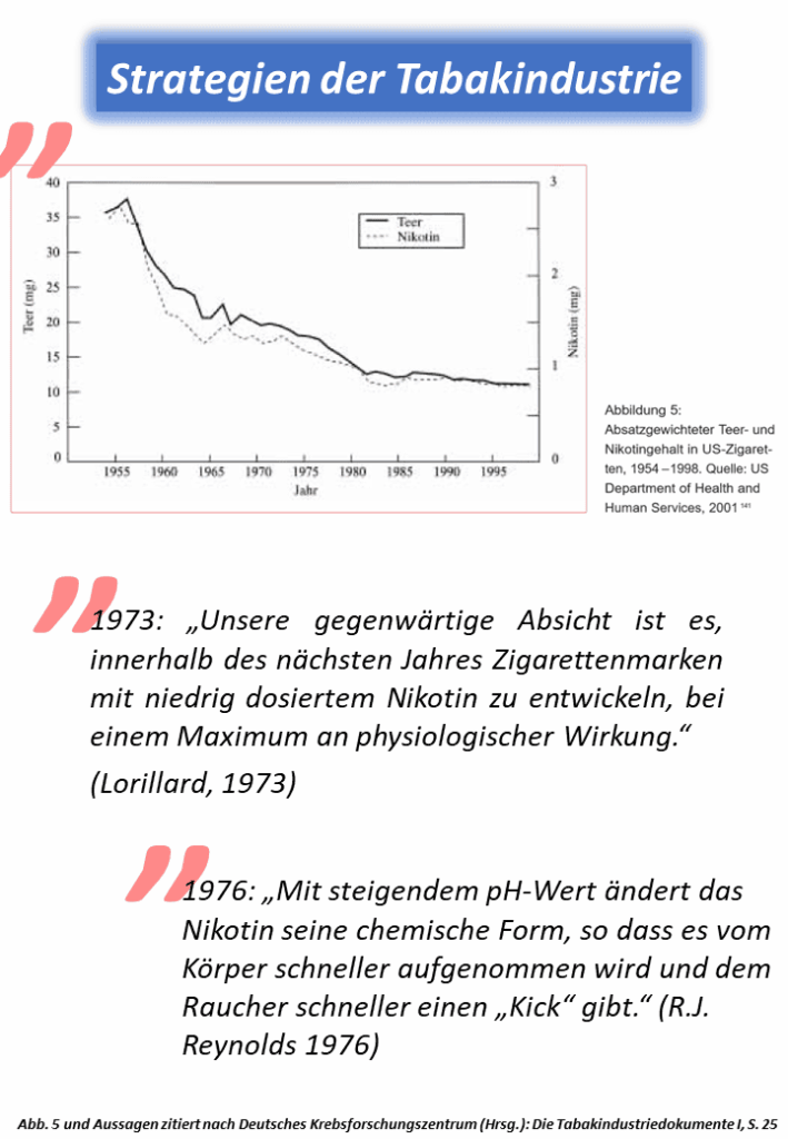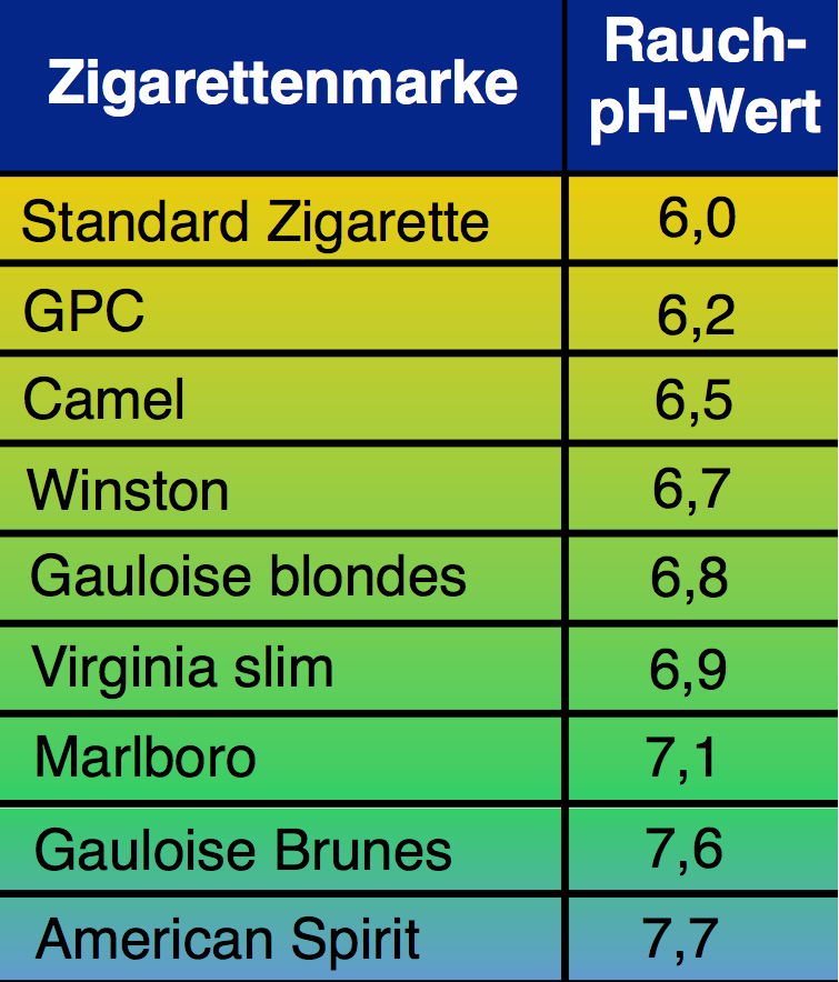 „Eine unverhältnismäßig große Steigerung des pH-Wertes wurde [von der Tabakindustrie übrigens] nicht verfolgt, da der Tabakrauch sonst nicht mehr inhaliert werden kann.“ 4