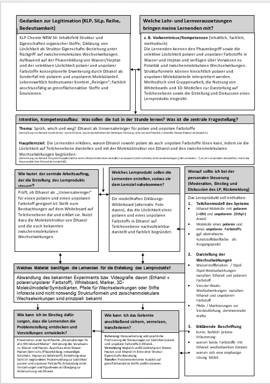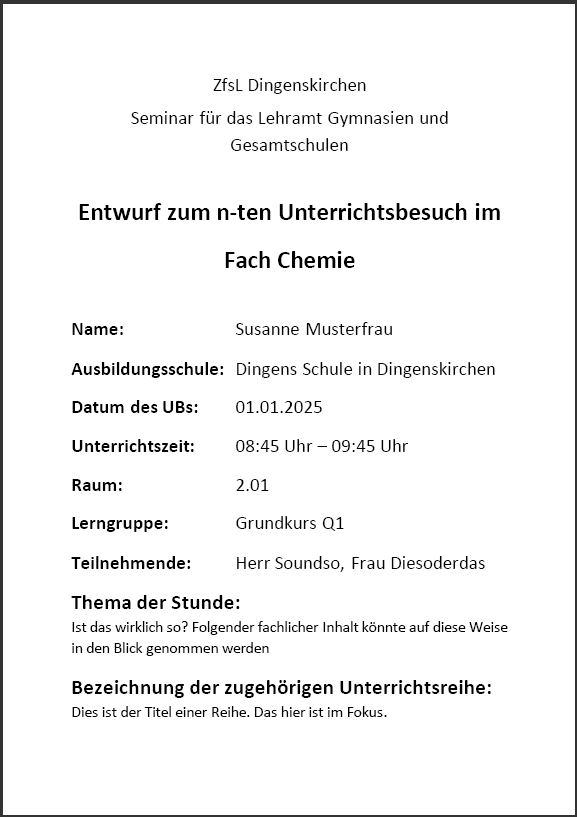 - Darüber hinaus kann eine Planung erhellende Informationen für Beobachtende (Ausbildungslehrkräfte, Fachleitungen) bereithalten. Sie macht Ihre Überlegungen, Entscheidungen und Schwerpunktsetzungen transparent und anschlussfähig für das Nachgespräch.